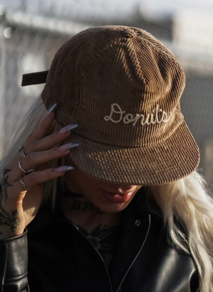 The unisex unstructured vintage style cap features the "Donuts" written in chainstitch. The hat is made of corduroy and has a fabric strapback closure.